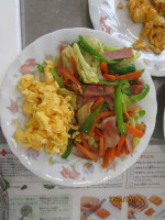 今日のメニューは「ハム入り野菜炒め」と「スクランブルエッグ」です。自分が持ってきた材料を洗って切って準備をします。卵は上手に割ってよくといておきます。
